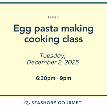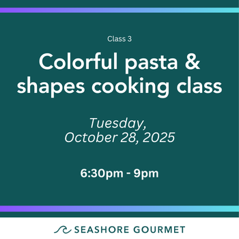 Shop classes Filled pasta making class - Thursday, Oct 16, 2025 $100.00 Register > Added! Colorful pasta and shapes class - Tuesday, October 28, 2025 $80.00 Register > Added! Egg pasta making class - Saturday, Nov 1, 2025 $80.00 Register > Added! Filled pasta making class - Thursday, Nov 13, 2025 $100.00 Register > Added! Colorful pasta and shapes class - Wednesday, Nov 19, 2025 $80.00 Register > Added! Egg pasta making class - Tuesday, Dec 2, 2025 $80.00 Register > Added! Filled pasta making class - Thursday, Dec 11, 2025 $100.00 Register > Added! Colorful pasta and shapes class - Tuesday, Dec 30, 2025 $80.00 Register > Added! Seashore Gourmet Gift Certificate from $50.00 Select Value $50.00 $80.00 Purchase Added!